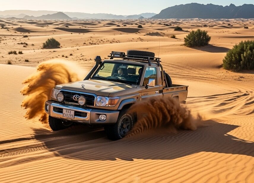 The Toyota Land Cruiser Pickup and Hilux stand out, thanks to their robust 4WD systems and high ground clearance, making them ideal for navigating deep sand and remote routes.