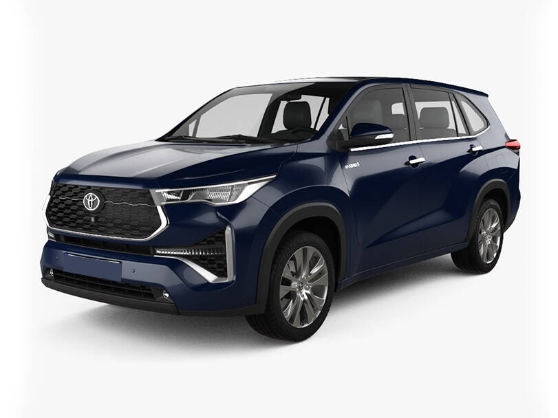 The exterior of the Toyota Innova in KSA showcases a bold and dynamic presence suitable for both family and business use. All trims feature a commanding front fascia with a large chrome-accented grille and stylish LED headlamps paired with integrated daytime running lights. The body lines are smooth yet assertive, conveying a refined profile for an MPV. Fog lamps are equipped on higher trims for added visibility. The GL and GL HEV trims are equipped with 16-inch alloy wheels (205/65 R16), while the VIP7 HEV trim upgrades to larger 17-inch alloys (215/60 R17), offering a more premium and planted stance.