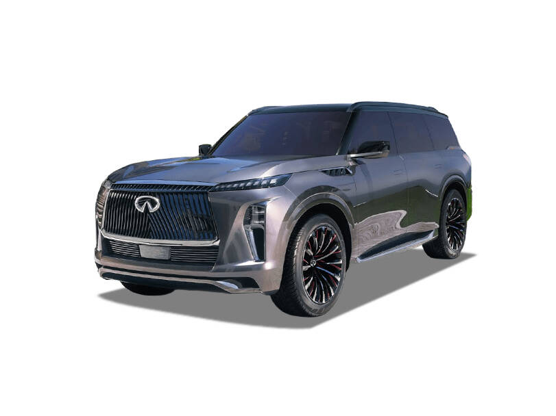 جاء التصميم الخارجي لـ إنفينيتي QX56 بتفاصيل قوية وأنيقة تعكس حضورًا فخمًا ومهيبًا. وشملت الواجهة الأمامية شبكًا كروميًا كبيرًا، ومصابيح أمامية بي-زينون مع لمسات LED مدمجة، وجسم مرتفع يضفي طابعًا عضليًا.